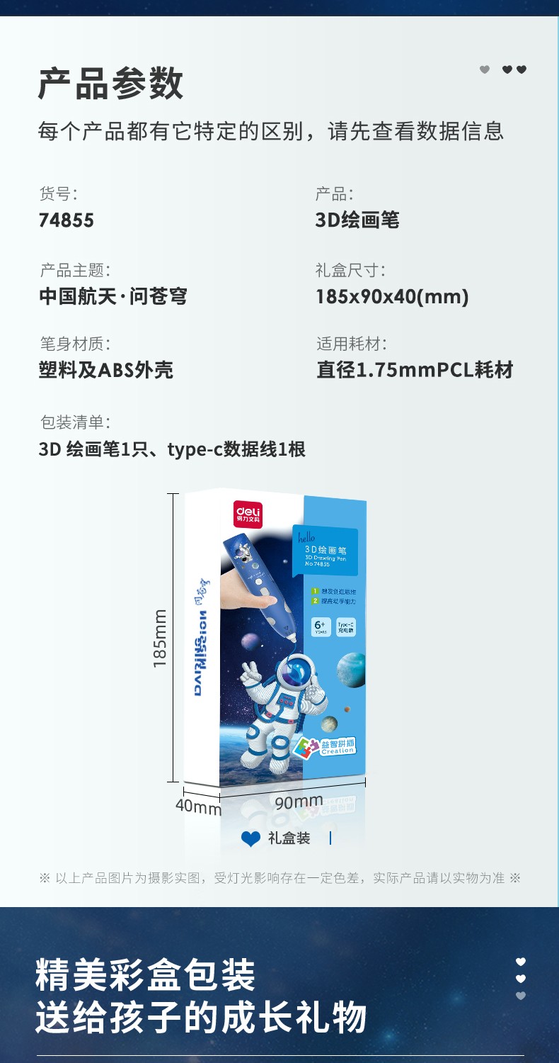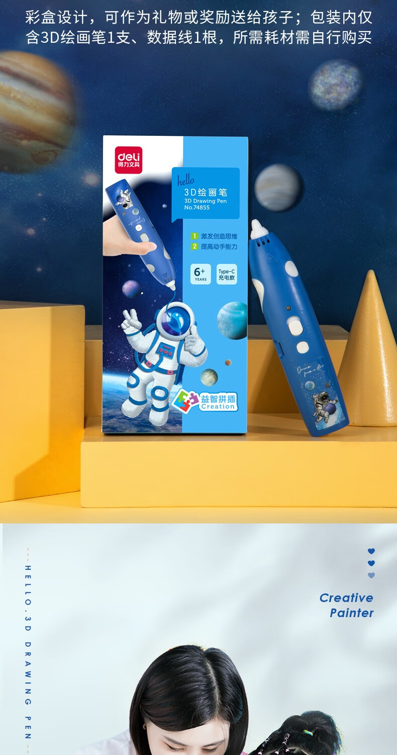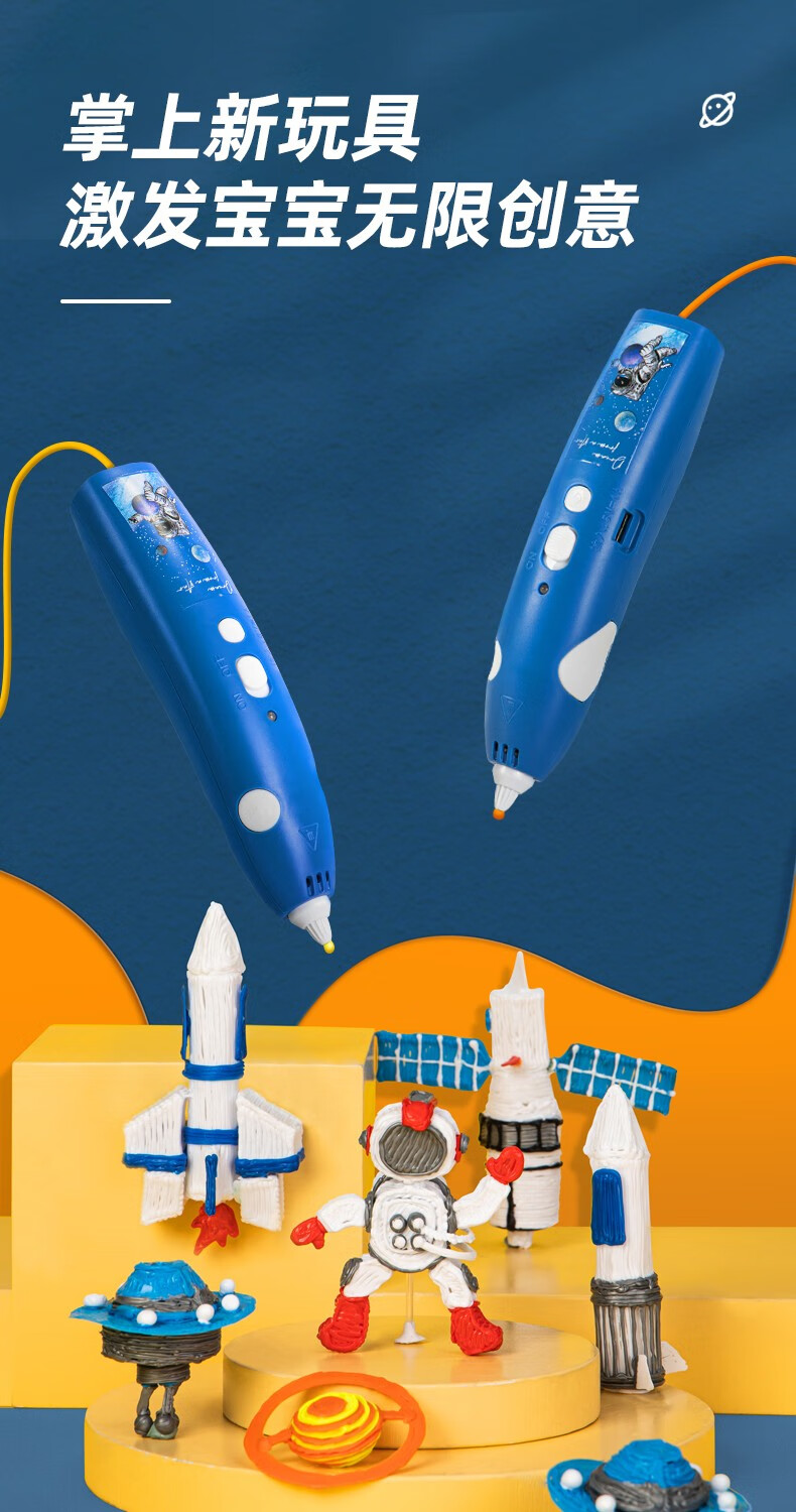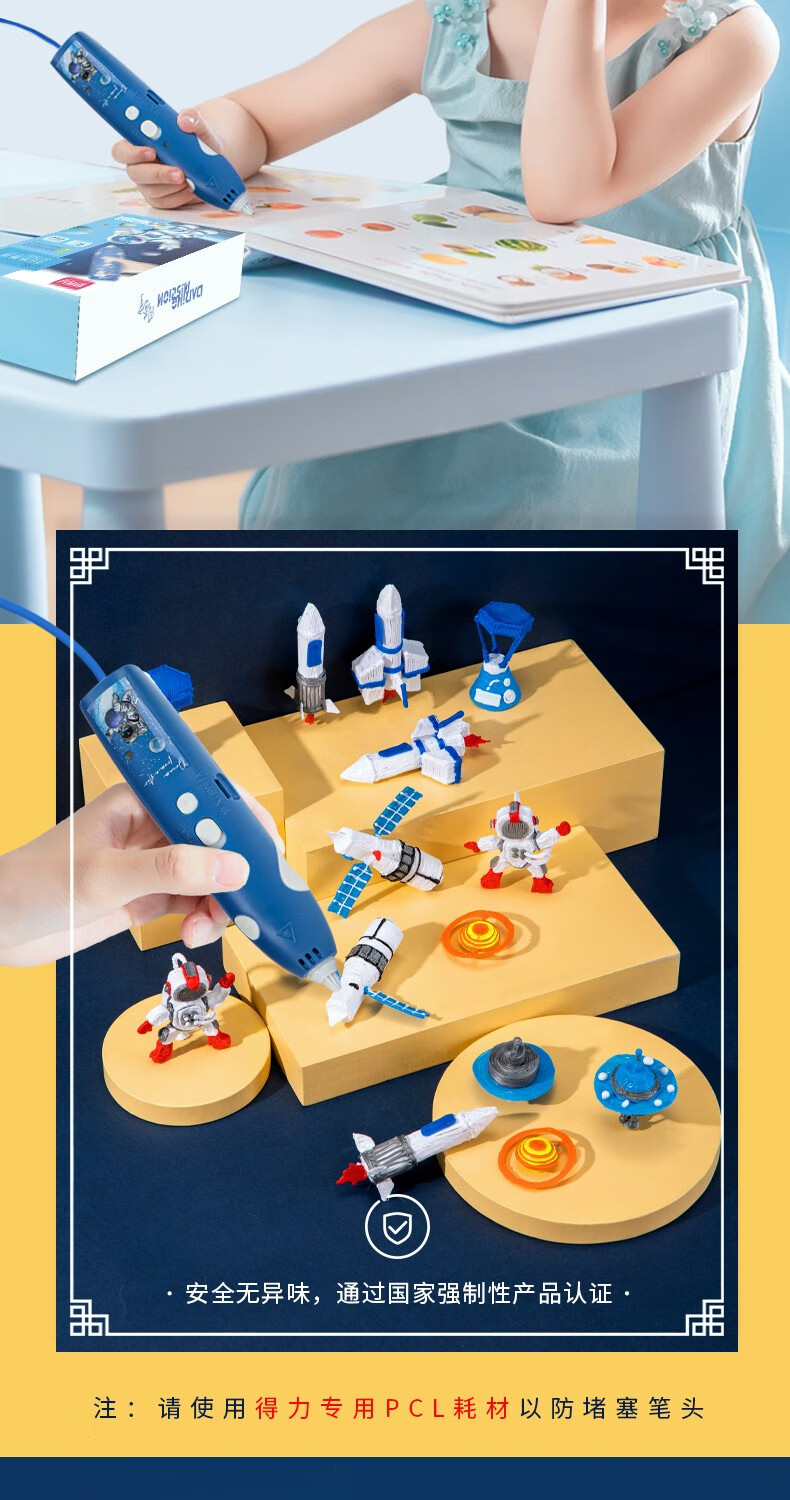 ¥5.34得力(deli)中國航天問蒼穹系列 3D打印筆 兒童立體涂鴉繪畫套裝充電款低溫安全打印神筆 【問蒼穹】打印筆+100米耗材套裝